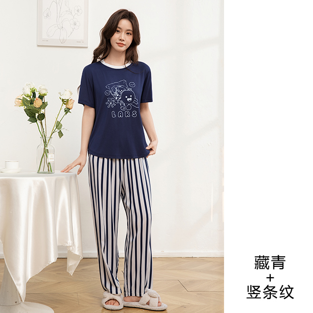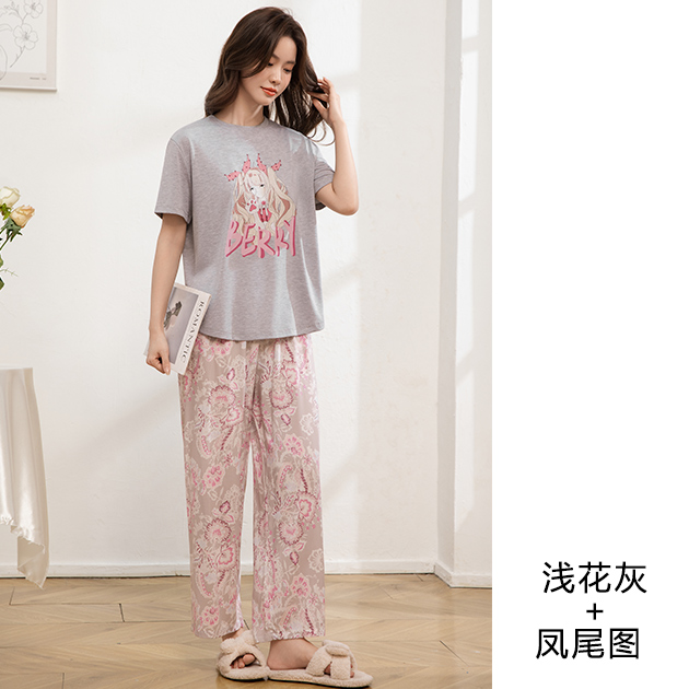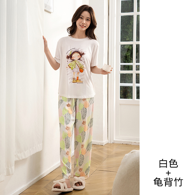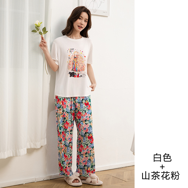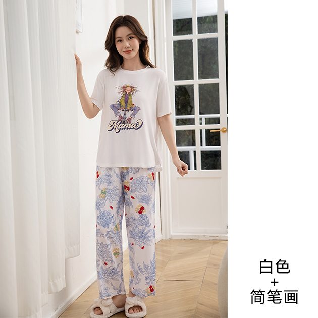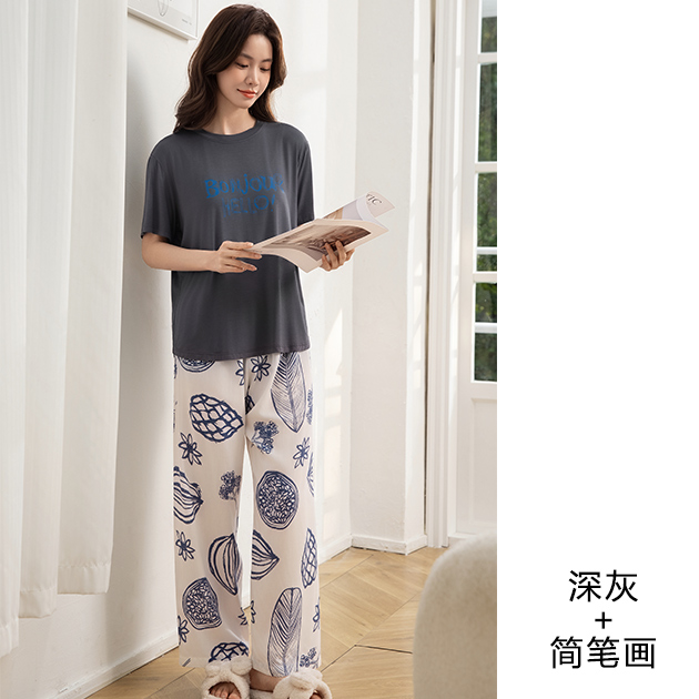 - 莫代尔女圆领烫画短袖长裤套装