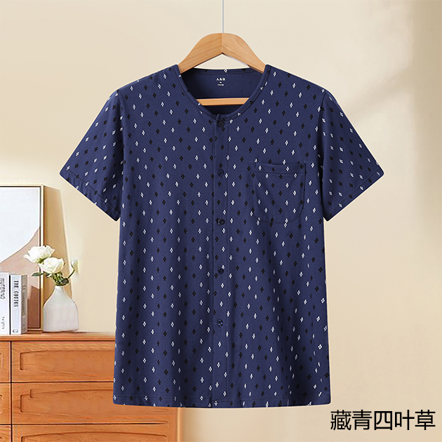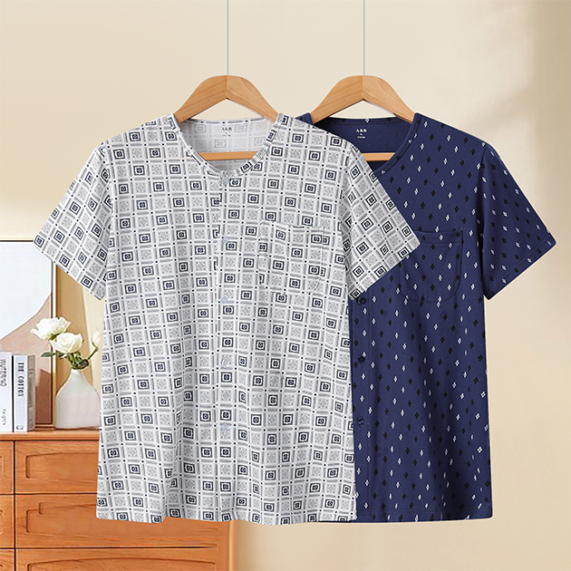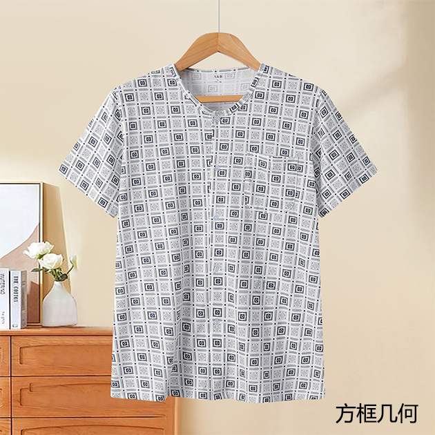 男紧密纺印花圆领贴袋短袖衫