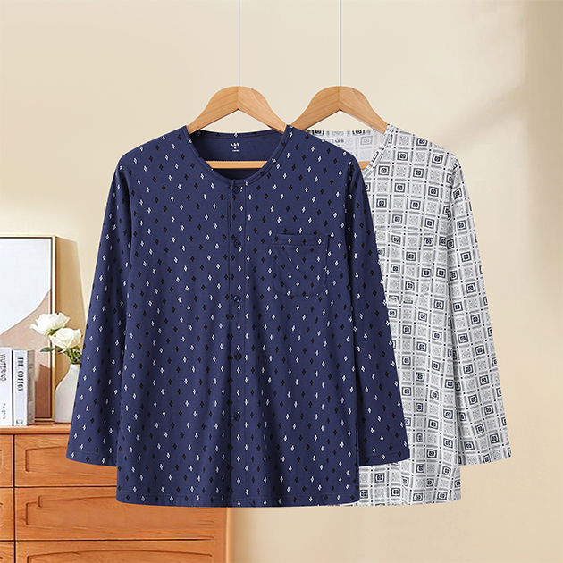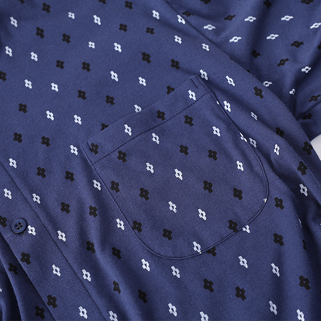 男紧密纺印花圆领贴袋长袖衫