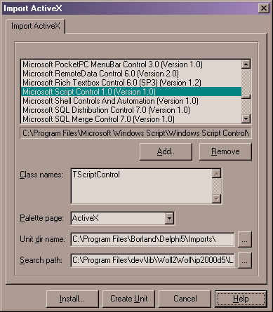 Scripting languages are nothing new. From the DOS batch file you wrote years ago, through to the ASP code that drives your website, scripting languages are a good solution to certain problems. However, the Delphi community in general seems to have been slow to latch on to scripting languages. Maybe it's the Visual Basic connotations in VBScript, maybe it's the fact that these languages are interpreted, or maybe it's just that a lot of developers associate scripting with web applications and don't look any further. However, once you realise how easy it is to use scripting with your Delphi application. The ability to run external scripts from within your application, and give those scripts access to whichever parts of your application you wish, starts to suggest some interesting possibilities. The fact that these scripts can be changed with nothing more than a text editor, by end-users already familiar with writing macros in Microsoft Word, without requiring you to recompile your application is an extremely powerful (and possibly a little scary) proposition. In this paper I'll show you how to use the Microsoft ActiveScripting technologies to achieve everything we've just mentioned. While there is more to these technologies than can be covered by a single paper, by the end of this paper you'll know more than enough to start planning how you can use this technology in your application. Setting Up Once you've downloaded and run the installation, start Delphi and go to the Component | Import ActiveX Control... menu. Scroll down to the Microsoft Script Control as shown below, then click Install to install the component into Delphi's palette.