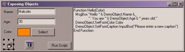You can catch these exceptions using a try..except clause in the usual manner. However, their is an alternative. The ScriptControl exposes an Event called OnError, which, not surprisingly, fires whenever a runtime error occurs. It also exposes a bunch of properties that gives us more detail about the last error that occurred, such as Description, Line, Column, Number (Error Number), and Text (a snippet of the source code surrounding the error). The Script Control will abandon execution of the script after the first error. Exposing your Application Objects to Script The first thing to note is that any functionality we wish to expose needs to be wrapped up as an Automation object. That isn't to say that the logic needs to reside in the Automation object, but your application will need to "house" some Automation objects that delegate their operations to the rest of your application. Let's have a look at an example. With the sourcecode accompanying this paper, you'll find a Delphi project called ExposingObjects.dpr. Let's have a look through what it does. Firstly there's a form which contains 2 TEdits, 2 TButtons, a TMemo, a TShape, 3 TLabels,, a TColorDialog and TScriptControl, arranged like this: