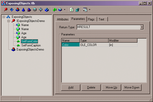 Click on the Refresh button, which should update the uAutoObject.pas unit with stub methods for each of the items we just added. Add the main forms unit to the implementation uses clause, then complete the stub methods like this: function TExposingObjectsDemo.Get_Age: SYSINT; function TExposingObjectsDemo.Get_Name: OleVariant; procedure TExposingObjectsDemo.Set_Age(Value: SYSINT); procedure TExposingObjectsDemo.Set_Name(Value: OleVariant); procedure TExposingObjectsDemo.SetFormColor(Color: OLE_COLOR); procedure TExposingObjectsDemo.SetFormCaption(Caption: OleVariant);