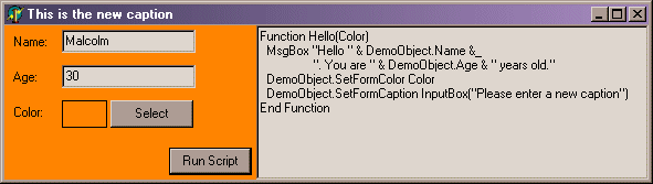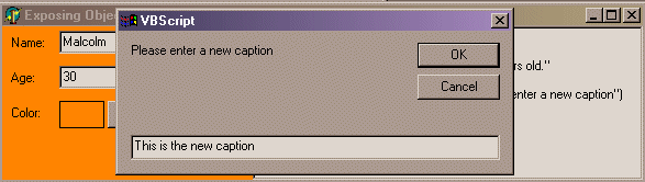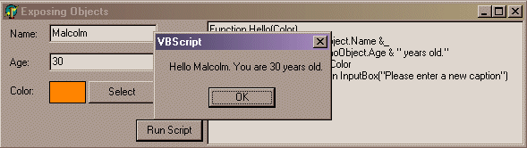 Let's just recap before we continue. We've created a bunch of methods in our main form to manipulate various properties. We've created an Automation Object with properties and methods which delegate to these main form methods. What we still have to do is make this object accessible to our script. We do this in the OnShow event of our main form: procedure TForm5.FormShow(Sender: TObject); FAutoObject := TExposingObjectsDemo.Create; The first line is one you should be familiar with by now, passing the ScriptControl a refernce to our form's window handle. It's the next 2 lines that interest us. We create an instance of our Automation object (FAutoObject is declared in the Private section of our form, as type TExposingObjectsDemo. We also added our uAutoObject to our main forms interface uses clause). Then we call ScriptControl1.AddObject passing it 3 parameters: A string representing the name that our Automation object will be visible visible as from our script. In this case, I've chosen "DemoObject" The second parameter is the IDispatch interface of our Automation object. Delphi will do the QueryInterface on our Automation object for us. a boolean indicating if we want the members of our Automation object to be globally accessible. Now that we've called AddObject, our Automation object, and by extension selected parts of our application logic, is available to our script. Now, let's have a look at the script contained in the Memo: Function Hello(Color) The first thing to notice is that the function takes a parameter called Color. Remember, the value we're passing in here is taken from the Shape1.Brush.Color property. The first line simply shows a dialog with a string, however, the string is built by concatenating together values taken from the edit boxes on our main form, via our Automation object. The next line calls our Automation object's SetFormColor method to change the forms color to whatever value was passed in as the parameter to the method. Lastly, we're calling the SetFormCaption method of our Automation object, but what we're passing as the parameter is the return value from another VBScript function, InputBox, which prompts the user to enter a string. The following screen shots show the flow of this script.